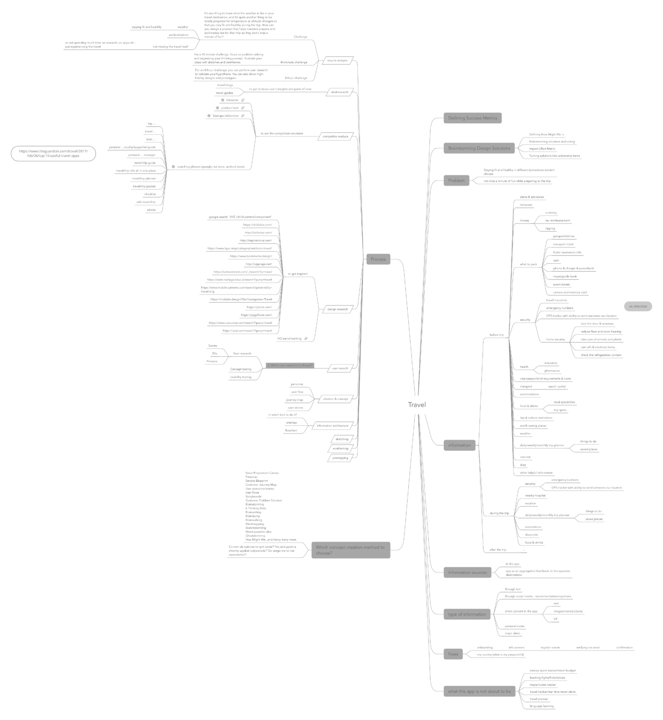 The topic of travel is very broad as there are many aspects to it. There are a multitude of different problems that travelers face that it would be impossible to address all through the creation of a single app. In order to narrow the scope of the project, I created a mind map of the different segments of travel. I divided my map into 3 main sections: before, during, and after. This represented the different aspects of travel during different points of time of a trip.