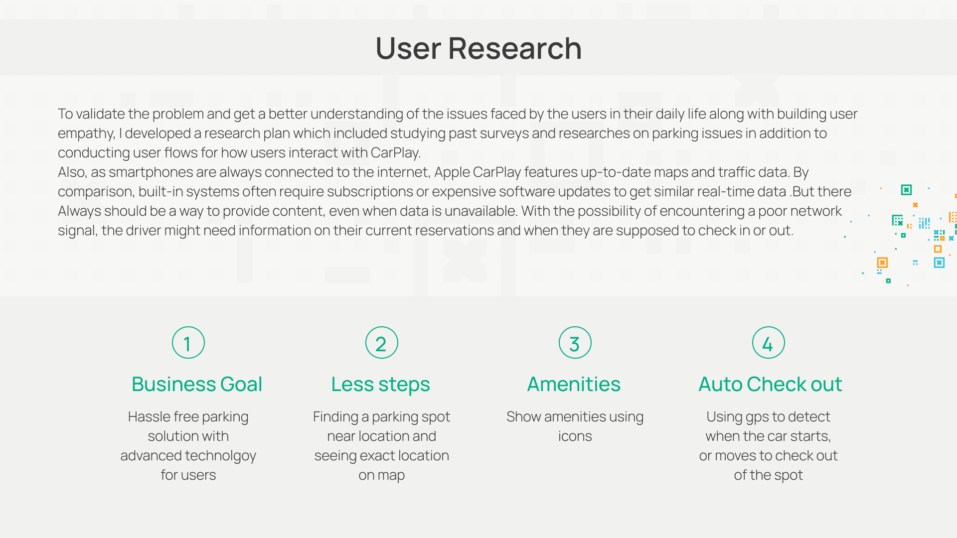 Uncovering pain points was pivotal in identifying the need for in-car parking solutions. Pain points included the challenge of drivers forgetting to check out of spots, leading to additional charges, concerns over distracted driving, and the necessity to minimize time spent on parking searches.
