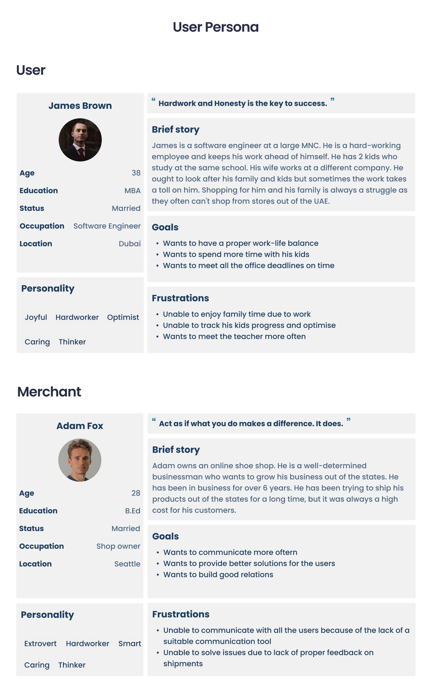 User Personas: Based on the user research findings, we created user personas, such as James Brown. These personas helped us empathize with users, understand their goals, and design solutions that cater to their specific needs.